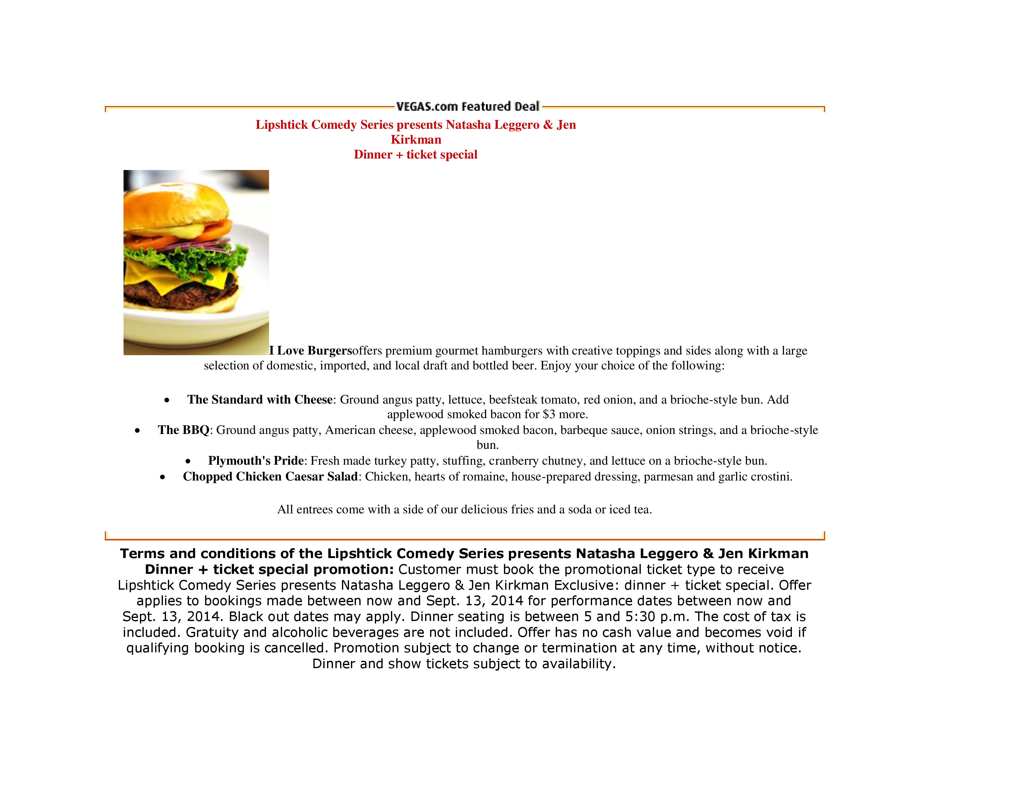 | Prices: Level C: rear & side view seating (yellow) - $52.25 NOW 44.00 Level B: seats in best viewing areas (orange) - $74.25 NOW $61.60 Dinner + Ticket Special 1: Includes Level B seating - seats in the best viewing areas (orange) and dinner at I Love Burgers Dinner seating is between 5 and 5:30 p.m. I Love Burgers is located inside The Palazzo. - $95.25